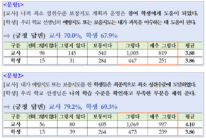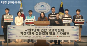 고등학교 교사 10명 중 9명은 고교학점제가 학생의 성장에 긍정적 효과를 주지 않는다고 봤다. 또한 과목 선택에 대한 고민으로 학생들의 진로 스트레스가 커졌다고 평가했다. 2명 중 1명의 교사들은 현행 학업성취율 40% 이상, 과목 출석률 2/3 이상의 이수 기준을 폐지해야 한다고 응답했다. 전국교직원노동조합, 교사노조연맹, 한국교원단체총연맹 교원 3단체는 전국 고등학교 교사 4060명을 대상으로 고교학점제 관련 설문조사를 진행하고 그 결과와 의미를 25일 더불어민주당 백승아 의원, 국민의힘 정성국 의원이 공동으로 주최한 국회 기자