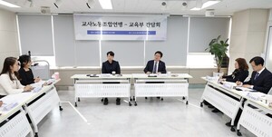최교진 교육부 장관이 5일 오후 서울 여의도 한국노총빌딩에서 교사노동조합연맹과 간담회를 하고 있다.