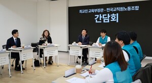 최교진 교육부 장관이 5일 서울 강서구 전국교직원노동조합을 방문해 간담회를 하고 있다.