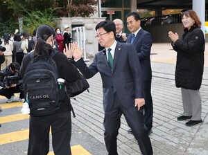 대학수학능력시험일인 13일 최교진 교육부장관이 수능시험장인 여의도여고에서 수험생을 응원하고 있다