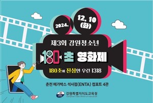 강원도교육청은 10일, 춘천 메가박스 석사점 컴포트 4관에서 ‘제3회 강원청소년 180초 영화제’를 열었다.이번 영화제는 학생 주도 협력형 예술활동 지원을 확대하는 사업의 일환으로, 청소년이 영화제를 스스로 기획․표현․실행하는 과정을 통해 예술적 감수성 및 창의력․상상력․사고력을 기르는 기회를 제공하고자 마련했다.지난 9월 작품신청서를 받아 11월 작품접수를 완료했으며, 작품의 창의성, 독창성, 구성력, 완성도 등을 중심으로 사전 선정 심사를 마친 후, 지난 11월 25일 본선 진출 우수작 10편을 발표했다.본선 진출 상영작은 △내