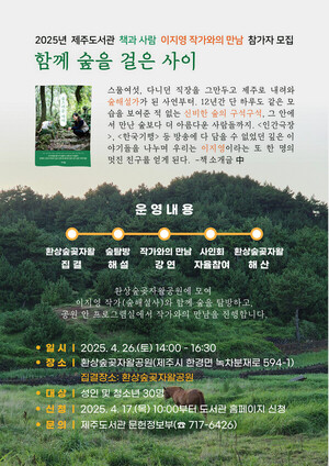 제주도서관은 오는 26일 오후 2시 환상숲곶자왈에서 “책과 사람 – 이지영 작가 강연”을 운영한다고 밝혔다.도민들이 작가와 직접 소통하는 경험을 통해 책과 도서관을 가깝게 느낄 수 있게 하기 위해서다.이번 강연은 환상숲곶자왈공원에 집결하여 이지영 작가와 함께 숲을 탐방하고 공원 안 프로그램실에서 작가와의 만남을 진행한다.이지영 작가는 제주에서 숲해설가가 된 사연부터 12년간 단 하루도 같은 모습을 보여준 적 없는 신비한 숲에서 만난 숲보다 더 아름다운 사람들과의 이야기를‘숲스러운 사이’(이지영, 가디언, 2023) 책으로 담아냈다.