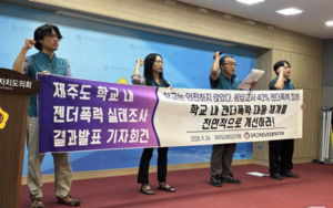 제주지역 교사 10명 중 4명이 최근 3년간 젠더폭력을 당했다는 조사 결과가 나왔다.전국교직원노동조합 제주지부(전교조 제주지부)는 24일 오전 제주도의회 도민카페에서 기자회견을 열고 ‘제주도 학교 내 젠더폭력 실태조사’ 결과를 발표했다.지난 3일부터 10일까지 진행한 실태조사에는 제주도내 교사 127명이 응답했다.응답 교사 가운데 51명(40.2%)이 젠더폭력을 경험했다고 밝혔다. 피해 교사 절반 이상은 30대(26명·51%)였고, 학급별로는 중학교 교사(28명·55%)가 가장 많았다.가해자는 학생이 82.4%로 가장 많았으나, 동